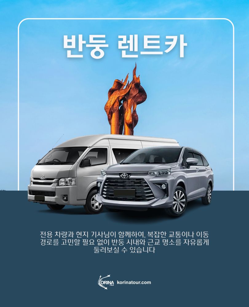 여행의 진정한 여유는 ‘이동의 편안함’에서 시작됩니다. 반둥의 매력적인 자연과 도심을 내 일정에 맞춰 자유롭게 즐기고 싶다면, 렌트카 서비스가 최고의 선택입니다. 전용 차량과 숙련된 기사님이 동행하여, 언어 장벽이나 복잡한 교통 체증에 대한 걱정 없이 오롯이 여행의 순간에 집중할 수 있습니다. 렘방의 상쾌한 공기 속에서 화산과 차밭의 풍경을 감상하거나, 치위데이의 푸른 호수와 온천을 찾아 떠나는 하루. 반둥 렌트카와 함께라면, 이동조차 여행의 일부가 되는 특별한 경험을 하실 수 있습니다.