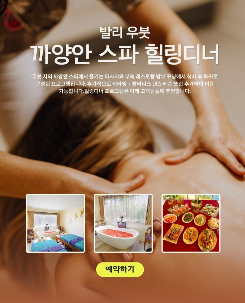 우붓에 투숙하시는 고객님들, 힐링디너 상품이 남부지역에 집중되어 있어서 아쉬우셨나요? 우붓에는 까양안 힐링디너가 준비되어있어요. 까양안 스파는 우붓의 아름답고 멋진 논뷰를 볼 수 있도록 룸이 배치되어 있어서 널찍한 창문을 통해 푸르른 경치를 즐기면서 마사지를 받을 수 있지요. 기본적으로 전통마사지 2시간으로 진행되나, 핫 스톤 또는 와인 스파로 업그레이드 할 수 있는 옵션이 준비되어 있어서 원하시는 타입으로 이용이 가능해요. 까양안 힐링디너는 다른 힐링디너와는 색다르게 옵션으로 티타임과 발리니스 댄스 레슨을 추가할 수 있어서 더욱 알찬 투어를 할 수 있다는 점이 특별해요. 시원하게 마사지를 받으신 후에는, 스파샵에서 약 30분 거리에 위치한 발레 우당 레스토랑 우붓에서 인도네시아식 세트 메뉴로 든든하게 식사하실 수 있습니다.